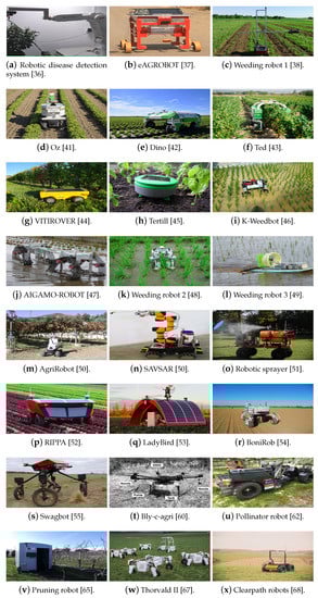 After finishing the sowing stage, maintaining the planting growth properly, that is, free of diseases and pests, requires constant monitoring by the farmer. According to FAO data, about 20 to 40% of world crop production is lost due to pests and diseases [32]. The good growth of crops invaded by weeds is strongly compromised and can even destroy crops completely. Weeds can also attract pests in addition to small animals like snakes and mice. Thus, the sooner it is extracted, the lower the financial losses. As an example of these costs, in Australia weed management costs are close to $4 billion a year [33]. Plant treatment is commonly done by applying herbicides and pesticides (insecticides and fungicides). The searches for the automation of the diseases’ identification process in plants and detection of weeds are not recent—there have already been works in this area since 1998. In [34] a robotic weed control system for tomatoes is described, based on the Bayesian classifier algorithm, that correctly identified 73.1% of tomatoes and 68.8% of weeds in the validation set of field images. In [35], researchers Lee and Slaughter chose to develop the hardware-based neural network, rather than the Bayesian classifier, for increasing the plant identification. With this new classification method, the robotic system correctly identified 38.9% of tomato cotyledons and 85.7% of weeds. These were just the first robotic systems applied to weed control, from a series of robots that have been developed over the years. Therefore, this subsection will address several works related to these agricultural tasks, focusing on its latest developments.