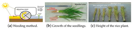 Japanese researchers Sori et al. analyzed the development of paddy fields with weeds, removing weeds with herbicide application and removal through the robot (shown in Figure 6k). As its results indicate in Figure 7, the use of the robotic system together with more spaced rice crops allows several improvements for the growth and crop yield, such as bigger roots, stems, leaves, height and weight of the rice [48].