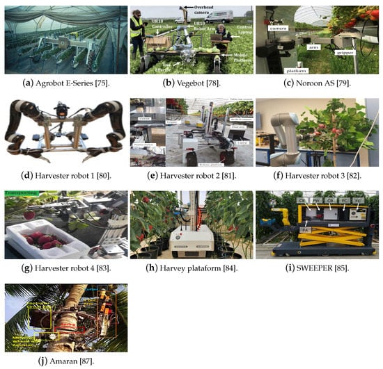 In addition to being a repetitive task and requiring agile execution, the harvesting activity requires a lot of effort from the harvester. According to Hayashi et al., harvesting operations represent around 25% of all hours of agricultural work in Japan [70]. Concerning financial costs (an important decision factor in farmers’ decision-making), in 2014, in Australia, labor rent represented between 20% and 30% of total cash costs [71] and in China, in 2019, it represented more than 75% of production costs and increasing annually [72]. This difference in values, between Australia and China, is due to the higher level of automation of the tasks of Australian crops. In this way, several works (see Figure 8) are being carried out proposing the use of robotic systems to perform agricultural harvesting activities. Several scientific articles address different image processing techniques in different types of cultures. In [73] during the design and implementation of an aided fruit-harvesting robot, Ceres et al. found that the main difficulties in the development of these types of systems were: driving the robot through the field from tree to tree and from tree row to tree row; detection and localization of fruits; and grasping and detaching of selected targets. Another relevant work carried out in the 1990s was the autonomous mobile robot AURORA for greenhouse operation, capable of autonomously navigating the greenhouse corridors using only the information provided by ultrasonic sensors [74]. The robot was built to be a multitasking platform, to perform tasks such as: harvesting, transportation of fruits and plan inspection. In this case, the project requirements were: navigation in unaltered greenhouses, low cost, flexibility, multi-functionality, supervizable autonomous operation and friendly user interface. In their work, Bac et al. analyzed about 50 applications of robots from different regions of the world in carrying out agricultural harvesting activities [18]. However, despite all the reviewed works proposing the use of robots to carry out harvesting activities, only the task of capturing fruits showed an improvement trend, when compared to the works done in the period between 1984 and 2014. In other activities, the evaluated robots have not yet performed well enough to replace a human harvester [18].