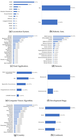 In general, all robots were evaluated according to the following criteria: its locomotion system, what is the final intended application, if it has sensors, robotic arm and/or computer vision algorithm, what is its development stage and to which country and continent they belong. These evaluation criteria were chosen in order to highlight the main technologies used to perform each agricultural task and to highlight which are the countries and continents that have the largest number of agricultural robotic systems, in order to correlate the use of such systems with the real needs of the agricultural market in each region.