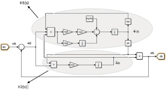 As shown in Figure 2, after linearization, two transfer functions and are performed. Linearization results in a decoupling of the estimate of the amplitude and the estimates of the frequency. Thus, the initialization phase, the estimation of the amplitude can be managed independently of the frequency estimation. The calculations are not detailed in this paper. The result of linearization leads to: