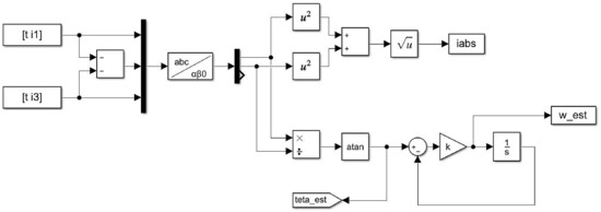 The adaptive observer used in this subsection is defined as direct and quadrature (d/q) components [22,23]. The rotor speed and the angular position are estimated from the error between the stator currents measured and those estimated by the model. An adaptation mechanism is designed using the error of estimation of the stator currents in order to estimate the speed of the rotor. The adaptive model takes as feedback the output of the adaptation mechanism (i.e., the speed of the rotor). The adaptive observer structure is shown in Figure 10, where the stator currents are chosen as state variables in the adaptive model. Regarding the stability study, the paper specifies the elements that characterize the robustness property of stability from experimental tests.
