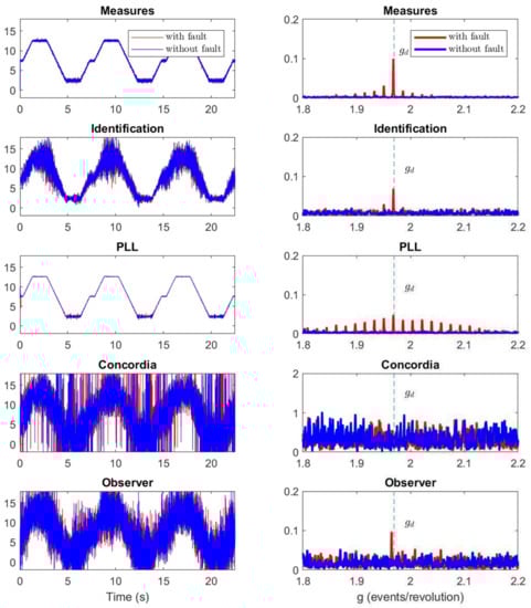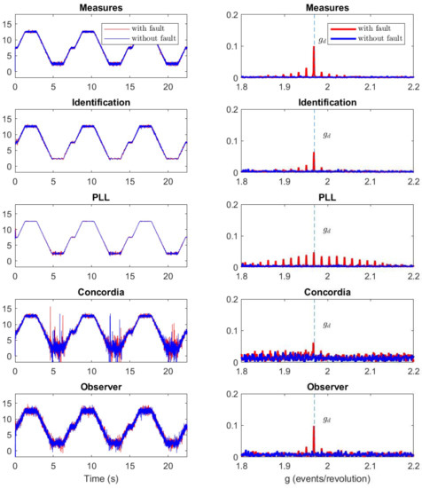 Note that all the methods give estimated noisy speeds, except the PLL. Filters used to normalize the current signal at the PLL input have filtered out noise. When the estimate is too noised, there is a risk that the information about a defect is drowned in the noise. The addition of an additional filter possible, however its adjustment is delicate: it is not necessary to filter the information concerning a sought fault. Despite the noise on the estimated speeds, the identification algorithm and the observer allow the location of the fault by their natural filtering: an integrator (low pass filtering) is necessary to obtain the angular position which is used for the resampling. Note that the least effective method without filtering seems to be the Concordia transform. The Table 4 shows that the ratio calculated for the PLL is the best, which is predictable because this method is the only one which offers bandpass filtering of the signal by its OSG filters.