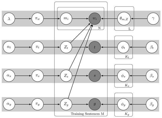 Graphical representation of the probabilistic model. Indices i, t, s, and g denote the order of words, emotion types, emotion strengths, and genders, respectively.