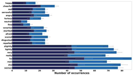 Each sentence has the following structure: “(the) gender is (emotion intensity) emotion type”, where gender, emotion intensity and emotion type are replaced by one of their corresponding synonyms (Table 2). If the emotion type is “neutral”, the intensity is always normal; thus, the sentence does not contain a word describing the intensity of the emotion and no corresponding concrete representation is provided to the agent. Additionally, if the gender is described by a noun, i.e., “woman” or “man”, it is preceded by the article “the”. Since the words used to describe a situation are randomly chosen from the available synonyms, how often each word occurs during training and testing varies, e.g., “cheerful” appears nearly twice as many times during training and testing as its synonym “happy” (Figure 3). Ten different interaction sequences, for which the order of the situations was randomly changed, are used to evaluate the grounding frameworks to ensure that the obtained results are independent of the specific order in which situations are encountered. The proposed framework receives situations one after the other as if it is processing the data in real-time during the interaction, while the baseline framework requires all sentences and corresponding concrete representations of the training situations to be provided at the same time. Therefore, two different cases are evaluated. First, the case in which all situations are used for training and testing, because this allows the proposed framework to continuously learn, while it is an unrealistic case for the baseline framework because it is very unlikely that all situations have already been encountered during training. Second, only 60% of the situations are used for training, which is more realistic for the baseline framework, while it adds an unnecessary limitation to the proposed framework by deactivating its learning mechanism for 40% of the situations, although it does not require an explicit training phase.