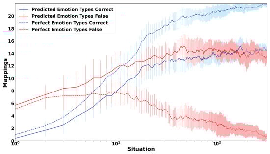 Mean number and standard deviation of correct and false mappings obtained by the proposed model over all 312 situations. The continues line represents the results when the predicted concrete representations are used for all modalities, while the dashed line represents the results when perfect concrete representations are used for emotion types to investigate the influence of the concrete representation accuracy on the grounding performance of the proposed model. For all lines, the dotted parts only occur when all situations are used for training.