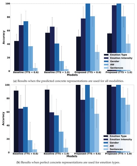 Figure 5 shows the accuracies for each modality for both models and test splits, as well as the percentage of sentences for which all words were correctly grounded. Additionally, it also illustrates the influence of the accuracy of the employed concrete representations by showing both the results for the predicted concrete representations of emotion types (Figure 5a) and when using perfect concrete representations for emotion types (Figure 5b). The proposed model achieves a higher accuracy than the baseline model in all cases, i.e., for all modalities, train/test splits and both concrete representations of emotion types, except for emotion types, when the predicted concrete representations are used and all situations are encountered during training. In fact, for genders, the proposed model achieves perfect grounding due to the high accuracy of the corresponding concrete representations, i.e., 89.8%. The figure also confirms the results in Figure 4 that the grounding accuracy improves with the number of encountered situations, which seems intuitive but is not necessarily the case, as shown by the results obtained for the baseline model, i.e., the latter obtained less accurate groundings for most modalities when using all situations for training and testing due to the larger number of situations in the test set. For the baseline model, using perfect concrete representations for emotion types increases the accuracy of the groundings obtained for emotion types and genders as well as the accuracy of auxiliary words, although the accuracy of the latter two only increases for TTS100, while the accuracy of the emotion intensity groundings decreases independent of the number of situations encountered during training.