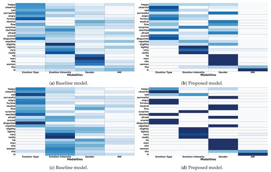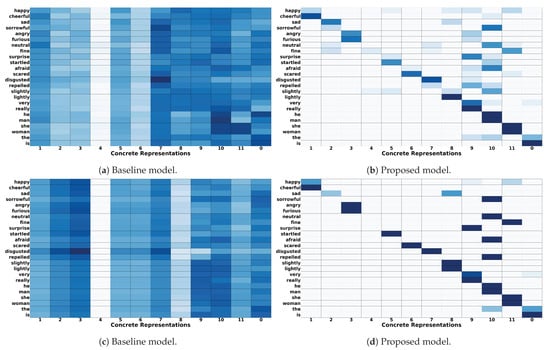 Although the accuracies provide a good overview of how accurate the groundings for each modality are, they do not provide any details about the wrong groundings or the accuracy of the groundings obtained for individual words. Therefore, Figure 6 shows the confusion matrices for all words and modalities, which illustrate how often each word was grounded through the different modalities and highlight two interesting points. First, both models show a high confusion for emotion types, i.e., all of them have non-zero probabilities to be mapped to concrete representations representing emotion intensities or genders, due to the low accuracy of the corresponding concrete representations for TTS60. The confusion decreases for TSS100, in which case most words converge to one modality for the proposed model, i.e., only “happy” and “sad” are still confused as a gender or emotion intensity, respectively. However, this does not lead to a substantial increase in grounding accuracy for emotion types because some words, e.g., “surprise” and “afraid”, converge to the wrong modality so that the probability to be mapped to a concrete representation of an emotion type decreases to zero. Figure 7 shows confusion matrices of words and different concrete representations, thereby allowing to investigate whether the concrete representation a word is grounded through is correct, which might not be the case if there is a high confusion between concrete representations of the same modality. The fourth column, representing the emotion type neutral, is very noticeable in Figure 7a,c,d because both models do not map any word to it, except for the proposed model and TTS60 (Figure 7b); however, even in the latter case, the probability that the word “fine” gets mapped to it is very low because most of the time it is mapped to the concrete representation of the concept male (column 11). Otherwise, the results show that, for the proposed model, the confusion is normally across modalities and not between concrete representations of the same modality. In contrast, the baseline model shows strong confusions between concrete representations of the same modality, e.g., for TTS60 “happy” and “disgusted” are more often grounded through anger than happiness and disgust, respectively.