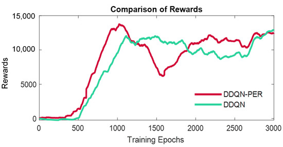 Rewards from the training with Turtlebot employed DDQN and DDQN with PER, respectively [32].