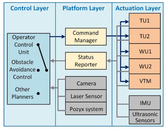 Due to the different properties of the various sensors, the software for the sensing system is separated into the actuation layer and the platform layer. The ultrasonic sensors, potentiometer, and the 9-axis IMU are interfaced with the microcontrollers. The raw data from these sensors are published to the status reporter together with the feedback information about the motors. The cameras, LIDAR, and an optional localization device named Pozyx [37] are directly connected to the single-board computer. The software processes to interface these sensors are in the platform layer. Each sensor publishes out a topic for acquiring and sending the raw data. The high-level controllers can then subscribe to the status reporter and the sensor topics for any required information.