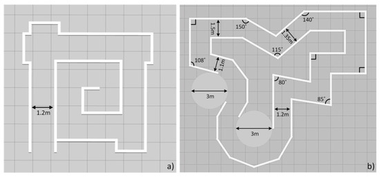 Figure 9. The training maps. (a) Map 1: a simple corridor-like path with some problematic scenarios. (b) Map 2: a complex circuit with different environmental features such as straight tracks, 90-degree turns, and acute and obtuse angle corners. - The three neural networks were applied to the virtual STORM successively to navigate the test map with similar features in Map 2, as shown in Figure 10, for five minutes. The metric for evaluating the performance of the neural networks is chosen to be the number of collisions undergone within five minutes of simulation.