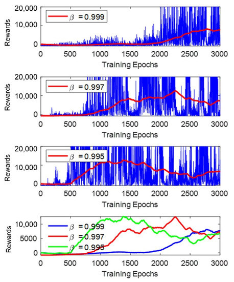 - The training process was performed three times in Map 2, as shown in Figure 9b, with the decay rate β set to 0.997, 0.998, and 0.999, respectively. Each neural network was trained for 3000 epochs for the following reasons: (a) All the three tests reach the lowest value of ε to choose a random action after 3000 epochs, for example, when β = 0.999, ε reaches 0.05 at epochs. (b) The current work did not include the improvement of the training efficiency. Training the neural network for 3000 epochs keeps the entire test within an acceptable training time, while at the same time ensuring that reasonable results can be obtained according to our previous experiences when training the neural network in [32].