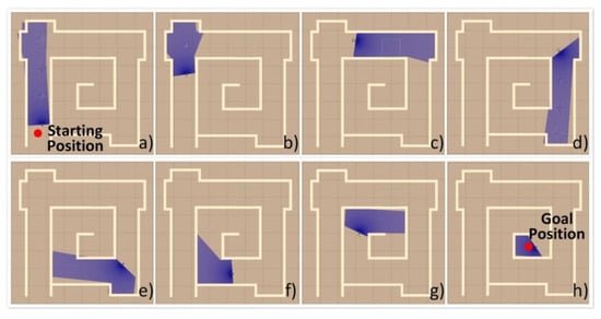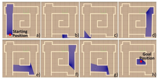 STORM locomotion module with the DWA local planner initialized at the (a) starting position goes out of the maze due to the lack of environmental information. In a recovery behavior, the robot comes up with a new plan and goes in the correct direction, as shown (b–d). At one of the corners of the maze, as shown in (e–g), the robot almost bumped into the wall and failed to come up with a reliable local path. It finally goes to the (h) goal position.