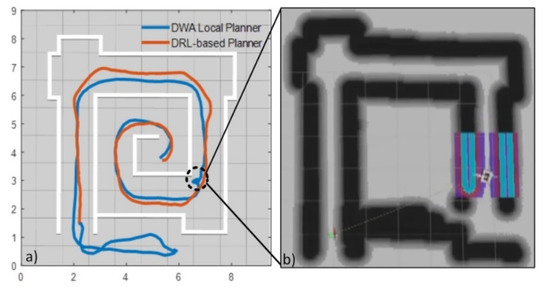 To demonstrate the advantages of the proposed DRL based planner, it was compared with the DWA local planner [30] in the virtual world, as shown in Figure 9a. There are mainly two reasons why this map was developed. The first one is to serve as the testbed for comparing the proposed method with the dynamic window-based method. The second one is to address the problem state in the introduction (Figure 1) by adding features in each corner of the map, which aims to demonstrate that the proposed method has the ability to avoid the problem mentioned in the introduction section.