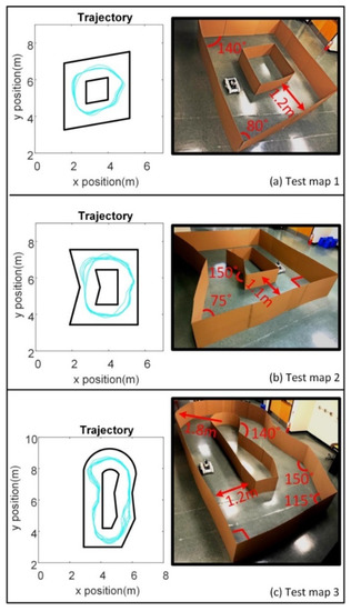 As mentioned before, the neural network found optimal actions based on the sensor observations in the simulated world, but the map was the same as that used for training. In order to validate the ability of the robot to travel without collisions, not only in the same map as the training case but also in environments with different features, three maps different from the training scenarios were built to test the robot. One of the maps had a circular feature with different diameters as compared to the simulated training environment. Figure 15 shows the three test maps and the trajectories followed by the robot when traveling through the maps. The robot traveled in each of the three maps for five minutes without collision. This proved that the proposed approach could handle situations different from the training scenario provided in the 3D simulation.