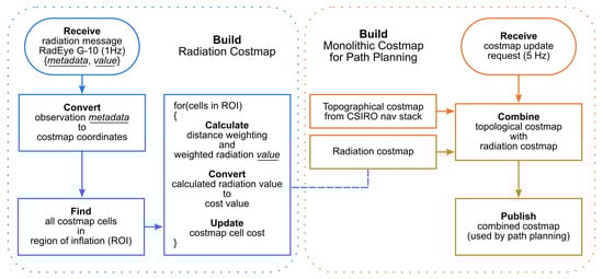 - An online method of generating a variable value radiation costmap from nonuniform point measurements of radiation and integration of this costmap into an existing costmap based navigation stack.