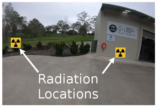 To simulate a gamma radiation source, two STS Safe-MiniSources [31] were placed in each environment, in the locations shown in Figure 4 and Figure 5. The Safe-MiniSources emit radio-frequency radiation and the RadEye G-10 on the robot was a modified unit [32] that had been converted to detect radio-frequency radiation rather than gamma radiation. A software package (ROS node) was produced to allow communication between the RadEye G-10 and a computer (the RadEye ROS node is on GitHub and available for use; please contact the corresponding author for access). To change the setup so that it would work in a real gamma radiation environment, the modified RadEye G-10 would simply need to be swapped for a standard RadEye G-10, commonly used in the nuclear industry.