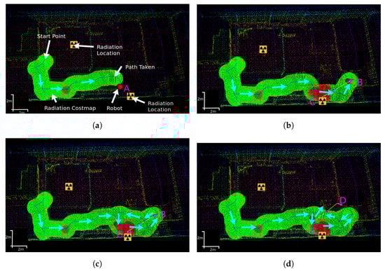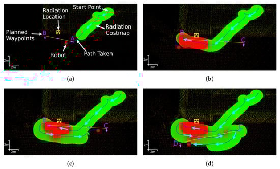 Figure 6 shows the robot navigating from the start point to each of the first four waypoints. The four images, (a) to (d), represent successive instances in time during the experiment. In each image, the global voxel map is shown, with the radiation costmap and robot’s path overlaid. With reference to Figure 6, the robot navigated from its start position inside the warehouse through the open roller door to waypoint A outside. In Figure 6a the robot is travelling between waypoints A and B and the radiation costmap laid out behind the robot is apparent. While moving from A to B, the robot passed one of the Safe-MiniSources that was placed outside against the warehouse wall. In Figure 6b the costmap shows the area of high radiation (and therefore cost) that was caused by passing close to the radiation source. In Figure 6c the path that was taken from B to C is shown and it is evident that the robot did not take the direct path (the yellow line) from B to C, rather the robot’s path planner navigated around the area of high radiation that it measured. Finally, in Figure 6d the path taken from waypoint C to D is shown; here the robot takes a curved trajectory (instead of the straight yellow line) that avoids the higher radiation levels that it measured on its path from B to C.