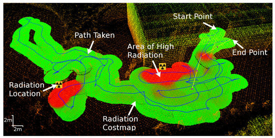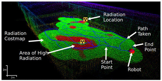 Outside of the radiation monitoring field, the use of additional information to improve the navigation scheme of an autonomous robot is common. For example, Sebastian and Pinhas [19] developed a path planning method for a tracked vehicle that takes into account information such as slip, slope of terrain and actuator limitations. In [20], an energy requirement costmap was generated for a UAV and used to increase flight times.