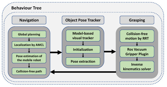 The robot starts in an arbitrary position outside the workstation and it will navigate to the closest view point in order to execute the first detection. As the layout of the content of an EVB is known, the number of instances of the same class and its priority of collection (i.e., which object class has to be collected first and which one afterwards) can be set. Afterwards, a window showing the current camera view will be prompted to the user where they could manually select and initialise the object’s pose, and thus initialise the tracking system. Therefore, the robot will attempt to approach the object and plan for grasping. After grasping the object, the robot will navigate to the respective bin where the arm is required to place it. The block diagram describing the aforementioned execution sequence is depicted in