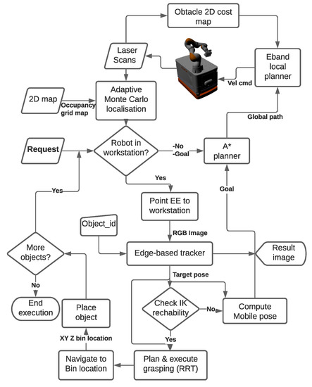 Figure 3. Furthermore, this diagram shows that an edge-based tracker is exploited to estimate the pose of a texture less object and the arm motion planner is used to plan and execute the suction grasping. Moreover, navigation capabilities are implemented such as A* for collision-free global path planning and Eband planner for path tracking and collision avoidance in a 2D map.