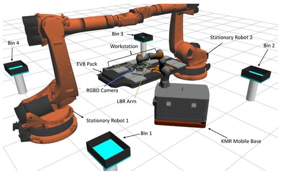 For the purpose of this work, we consider a scenario where an EVB pack is already dismantled using two KUKA KR500 robots, and the components are spread out as in the workstation depicted in