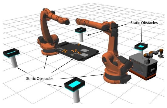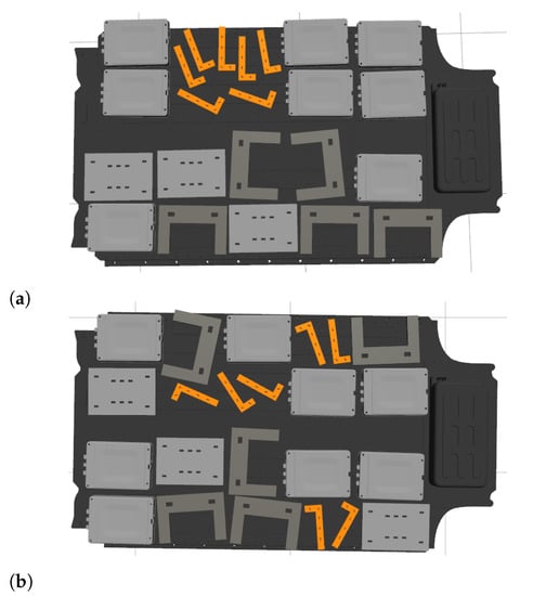 Figure 9a, is characterised as containing the objects clustered (except the battery modules) either to the bottom or the top side of the workstation as well as it respective containers. In other words, once the robot is on one side of the EVB, it does not need to navigate to the other side to grasp an object of the same class. However, the robot is still required to navigate to the other side once all the same-class objects have been collected. Furthermore, it is assumed that the EVB pack is mounted and fixed on an industrial table, such that this one does not move during the robot operation.