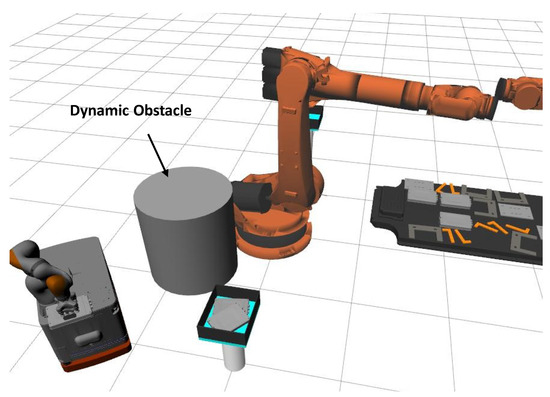 Figure 12, in this case study different dynamic obstacles in different primitive shapes were instantiated in front of the robot every single time it needed to either navigate to a container or to the opposite side of the workstation.