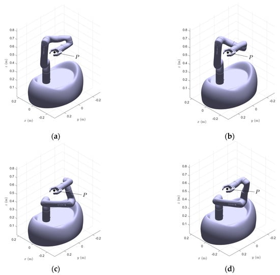 Figure 7a,c show the robot arm close to singular postures in and . In these configurations, the point (labeled in Figure 7b,d) almost intersects with the first joint axis, representing a singularity for the serial manipulator. The closeness to this configuration results in very low values of the dexterity parameter of 0.057 and 0.042, respectively. Moreover, the diagrams show that a change of the parameter from to results in a positive shift along the axis of the point where the arm was close to singularity. To avoid these issues, the table task space should be positioned with a non-null distance along , corresponding to a lateral approach of the manipulator to the task, as shown in Figure 8, where the robot posture is represented while reaching out to the extreme point of the task space.