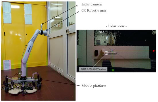 To fully perceive and obtain information from the surroundings, exteroceptive systems must be adopted. To provide this information, a LiDAR camera—Intel RealSense L515—was mounted and fixed to the fifth link of the arm, as shown in Figure 3. The camera uses an infra-red (IR) laser beam to scan its entire field of view (FOV), which is reflected and re-captured by an IR photodiode. The data are processed to generate depth cloud points as outputs that represent the entire FOV area, as shown in the figure, where the position of a door handle point with regard to the camera frame is measured. With the use of image recognition techniques, the camera both recognizes the object and calculates an associated reference frame. Once the posture of the robot is known, this information can be converted into the position and orientation of the object with respect to the base frame of the robot, allowing it to reach the object and interact with it.