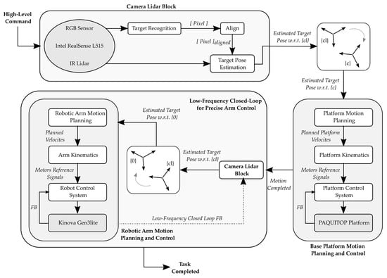 To better clarify how the system will work in real applications, Figure 4 presents the overall architecture for autonomous task execution. This strategy takes advantage of both the RGB sensor and the IR scanner to recognize the target and its pose with respect to the LiDAR camera r.f. This information is transposed into the r.f. so that it can be used to move the platform into a position where the robotic arm can better perform the given task. Once the platform motion is completed, a low-frequency closed-loop control is performed to precisely move the robotic arm towards the goal pose. The choice of moving the platform and the robotic arm separately has been adopted to simplify the control strategy at this preliminary stage.