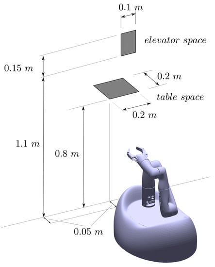 For both table and elevator tasks, the platform was supposed to be able to position itself with a minimum distance of 0.05 m between the task and the platform edge. In the figure, the robot arm is represented in a retracting posture, with mounting parameters of m, m and . This configuration of the robot arm kept the center of gravity low, which was beneficial during acceleration phases.