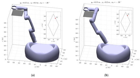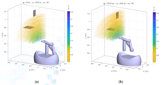 where is the maximum value of that the robot can achieve inside its workspace. It is worth noticing that does not influence the value of the length , because it has only the effect of rotating the whole structure along the first joint axis, so it has been neglected for the numerical solution of the problem. Now that is consistent in unit measures, the factor can be properly evaluated. Notice that the choice of and values have the beneficial effect of incrementing the value inside the task space, as mentioned above and reported in Figure 5, leading to a better capability of the manipulator to perform the desired task.