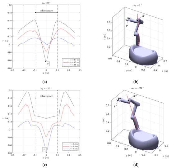 Besides, the study was conducted on a domain characterized by a range on the axis wider than the range selected for the task. Since the robot was required to exhibit good dexterity to manipulate objects on the table domain, this choice was made to evaluate the best position of the table task space with regard to the fixed r.f. for operating with the highest possible dexterity. From a different—yet equivalent—point of view, the study aimed to find the placement of the mobile platform that enabled the manipulator to operate with the best-allowed dexterity. For the sake of clarity, it is worth pointing out that the same extension cannot be done along the axis of : higher values of result in severe balance problems, due to a more extended posture of the manipulator, while with lower values, the platform would come into geometric interference with the table.