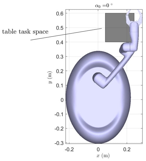 Task space representation with the arm in the retracted posture. The platform was supposed to reach the desired task space with a minimum distance of between the task and the platform edge. The mounting parameters were m, m, .