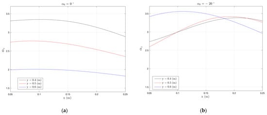 It is worth highlighting that the force ellipsoid strictly depends on the robot’s posture, defined by the vector of joint angles . Thus, a study was made with the same criteria adopted for dexterity analysis, meaning that the robot adopted the posture with the highest possible dexterity index. The resulting force transmission ratio along the axis of is reported in terms of level curves in Figure 10, where each curve represents the trend of at a constant value of . A global increase of the factor occurs if a tilting angle is applied, meaning that with , lower joint torques are required for the same applied forces on the end-effector within the selected task space.