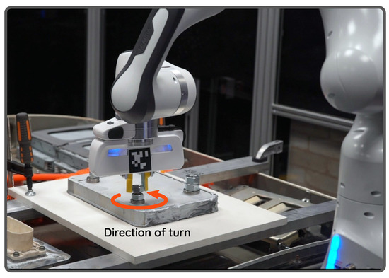 Various approaches have been made available in the literature for robotising screw or nut unfastening [3,7,10,11,12]. Very recently, Li et al. proposed a sequence of actions with a cobot to unscrew a hexagonal headed screw in which the robot performs a spiral search motion in order to engage an electric nutrunner onto the screw [3]. A “peg-in-hole” style controller with torque monitoring was used to position the tool to hold the screw. However, it is not clear whether their system can handle screws of different sizes without a tool change. A similar approach with a new bit-changing mechanism for unscrewing is presented in [7]. A torque estimation method using a wrench held by a three-finger hand is presented in [13]. Although the used setup is interesting to perform nut fastening tasks, the work focuses only on estimating forces for industrial robots without joint torque sensors. Recently, Pfeiffer et al. presented a robotic system centred on a humanoid platform, using a motorised wrench tool to demonstrate nut fastening [14]. Like ours, their system uses visual servoing to navigate the robot towards the desired object, and then switches to admittance control to position and fasten nuts. There are other special-purpose systems designed for various screw-related tasks. A visual servoing-based fastening robot is presented in [15]. Similarly, a mobile fastening robotic system is presented in [16]. Although most of these systems are flexible, they lack generalisation for nut sizes and often require additional hardware to change tools. Apart from these, some works targeted the designing of special-purpose fastening tools for robots. One such tool is presented in [17]. We refer the reader to [18] for more interesting nut-fastening tools. In addition, a few works presented intelligent control strategies to accomplish nut fastening. In this regard, a fuzzy logic-based controller is presented in [19] and a neural network-based monitoring schema for screw fastening is presented in [20].