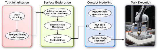 In this section, we present the technical details of our method. As mentioned before, we use the tactile information to model the shape of the nut and devise a strategy to grasp and unfasten a hexagonal nut. The proposed pipeline, depicted in Figure 2, consists of the following modules: system initialisation, where the robot is visually guided into the task-space; data acquisition where the robot starts exploring the scene and collects contact positional data; contact modelling where the nut pattern and its position are identified from the acquired data; and finally, task execution, where the robot is commanded to perform nut unfastening by executing a sequence of motions. These are presented below.
