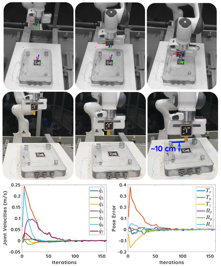 (top) Some screenshots showing our visual servoing process by which the tool is placed in the task space to start surface exploration. (Bottom) Joint velocity and pose error plots depicting the visual servoing convergence.