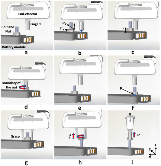 Once the exploration is accomplished, unfastening starts automatically (Figure 9). It is initialised by opening the gripper to its maximum stroke size. The two outputs from the previous exploration phase are (i) the location of the nut, i.e., its centre point pose with respect to the robot base frame; and (ii) parallel faces of the nut to position gripper fingers. The poses of these estimated nut faces are used to orient the gripper fingers, and a pinch grasp is executed to hold the nut. Alternatively, a model-free grasp planner, like that in [27], can also be used to plan a stable grasp trajectory.