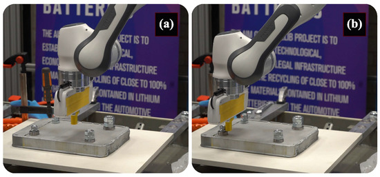 Experimental setup for nut unfastening. Replicating the real setup, a 3D-printed lithium–ion module is bolted onto a dismantled Nissan Leaf 2012 battery pack. The robot arm is equipped with a two-finger gripper.