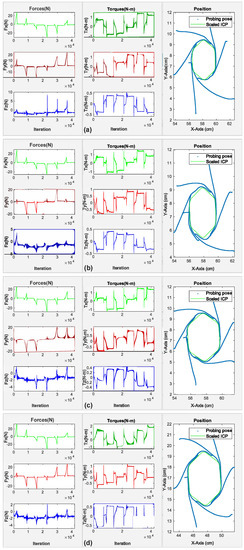 These initial experiments are conducted to evaluate the method’s performance in exploring and identifying the nuts. Succeeding the initialisation phase, the robot starts the surface exploration with constant velocities and to move in the plane. The Cartesian impedance values on all axes for the robot are set to , which are selected empirically. A greater value is used for the stiffness in the z-axis to compensate for the gravity and weight of the gripper. The bolt placements in the test rig is shown in Figure 6, and the robot moving from initial position to the exploration position is shown in Figure 7. The end effector position and the external wrench are recorded during the tactile exploration task. Figure 8 outlines the successful trials in exploring the contour profile of four different nuts, using our method. Once contact is established between the finger and the nut, the velocities in X and Y axes are sequentially increased until the external torque () exceeds the threshold on the nut’s edges. Although the used robot benefits from relatively high accuracy torque sensors with a resolution of <0.02 Nm and a torque noise (root mean square) of <0.055 Nm, relying solely on the probing pose is not feasible to find a robust grasp. Hence, SICP is used to find the appropriate transformation to align the gripper fingers with the parallel nut faces. The final column in the figure shows the positional data recorded during the exploration and the corresponding fitted hexagons, using SICP.