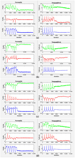 The wrench data show a breakdown procedure for determining the hexagonal pattern of the nuts during exploration. The peak points in show the turning points on the nut edges. The sign of the forces () changes on the turning points with respect to the direction of the applied velocity. Although the end effector continues to move along the contacted side due to the applied velocities (), a high amplitude torque indicates the turning point. Therefore, the end effector returns to the most recent torque pick point and originates its movement by adjusting the velocity with respect to the turning angle . On the turning points, when there is a high amplitude force in X-axis, a lower amplitude force in the Y-axis is appeared. A similar trend is observed for all four nuts during contact exploration. The plateau state between the peak points, for both forces and torques, indicates that the probe is not in contact with the nut at that particular point of time.