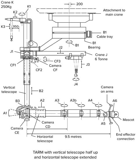 Telescopic Articulated Remote Manipulator (TARM) is a 1980s built, 22 degree-of-freedom serial manipulator with a payload of 600 kg that was custom-designed to carry out ex-vessel maintenance activities at JET. It features a large vertical telescopic mast with a vertical movement range of up to 11 m, and a horizontal boom with 8 DoF [15]. Highly dexterous, delicate in-vessel remote operations at JET are carried out by MASCOT. MASCOT is a 1960s built, high-fidelity haptic master–slave manipulator that allows the master operator to feel every action of the slave, from carrying a new component to tightening a bolt [16,17]. As the TARM was originally intended to carry out ex-vessel operations on the JET reactor, TARM has the capability of mounting the MASCOT manipulator as an end-effector, either on the horizontal boom (where it is labelled as the end-effector connection in Figure 2) or on the vertical mast (where it is labelled as B3 in Figure 2). A 6 tonne capable Crane J on a rotational ring is positioned at the top of the TARM to perform heavy lifting. For example, if a heavy component was installed in the JET assembly hall, Crane J would have been used to lift the component in and out of position, whereas MASCOT would have been used for bolting or similar delicate and dexterous lightweight operations including connecting surfaces. Similarly, 250 kg capable Crane K was designed to be used in the vertical mast only configuration, when MASCOT was attached to B3 in order to lift heavy items.