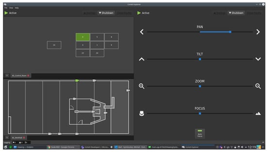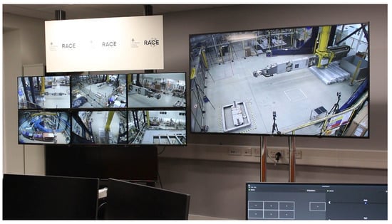 A Viewing System including multiple PTZ cameras, the control room with several monitors and a video multiplexer is used for this case study. The TARM is located within the RACE workhall surrounded by PTZ cameras. In order to represent a real operations routine, the operations are carried out from a control room where the operators observe the TARM through the PTZ cameras, from the monitors in the control room. A video multiplexer is used to direct the video outputs onto the monitors in the control room. In this case study, CorteX is used to control the PTZ cameras and control the camera to monitor assignment via an HMI. Figure 5 shows the live camera stream in the RACE workhall, and Figure 6 illustrates the CorteX HMI, which allows pan, tilt, zoom and focus functions for the cameras.