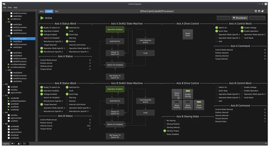 Figure 9 shows a view used to observe and control a dual-axis EtherCAT DS402 (motor drive) device. The view is split into two halves (top and bottom) to display both axes: Axis A and Axis B, respectively. The left side of each axis view shows the current state of the axis from the DS402 Observation, the centre drive control area shows state values and control buttons for the DS402 Processor, and the right side shows the demand state of the drive from the DS402 Modification.
