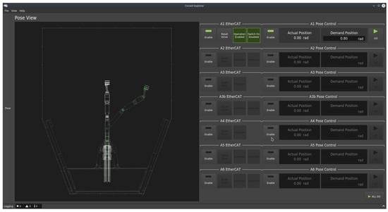 Figure 10 demonstrates several capabilities of the CorteX GUI framework. First, the view is split into two halves. The left side shows a representation of the physical TARM manipulator, posed to show not only the current position (in white) but also the target position (in green). This pulls data from a number of Axis Concepts, both observations and modifications, to pose the TARM image. This side of the view is specific to the TARM manipulator, as the robot visualisation is currently only capable of rendering the TARM. However, the right side of the view is generic and can be used for any multi-axis manipulator. This selection of controls is generated dynamically by searching through the Simplex model for any Axis Controllers, and creating a set of controls for each type of controller—in this case, they are all Axis Pose Controllers. You will also notice to the left of each pose control area is an EtherCAT control area. The controls in this area are also auto-generated, using the morphology to discover the device Processor related to each Axis Controller, and then generate a view for the specific device processor type—in this case, an EtherCAT DS402 Processor. Notice how the EtherCAT control area discovers the number of axes each processor is controlling, producing two status displays for axes A1, A2, A3B, A5 and A6, but only one for A3 and A4.