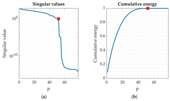 (a) Singular values of the matrix as a function of the number of the dynamic parameters ; (b) Cumulative energy of the matrix as a function of the number of the dynamic parameters .