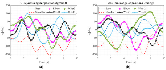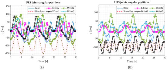 The resulting angular positions obtained for the UR5 collaborative robot are reported in Figure 2a. Similar values have been also found for the UR3.