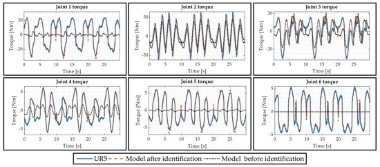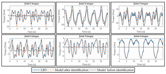 To evaluate the accuracy of the identified base dynamic parameters, in Figure 5 and Figure 6 the measured torques (UR3 and UR5, respectively) are compared with the ones estimated with the proposed mathematical model once that the base dynamic parameters have been identified (Model after identification). In addition, the joints torques (Model before identification), obtained using only the dynamic parameters provided by the manufacturer [1], are also reported.
